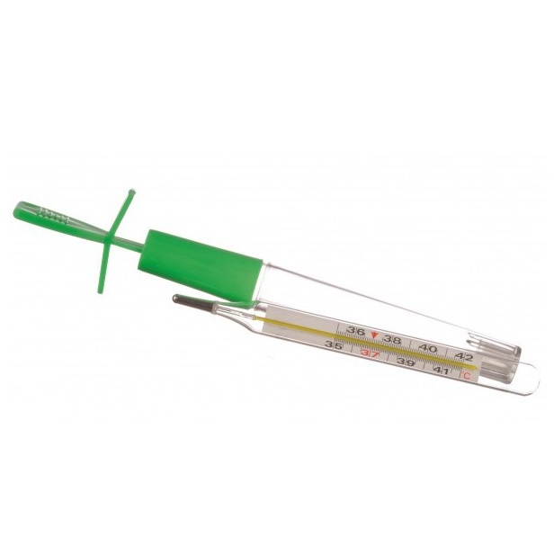Scuturati termometrul utilizand dispozitivul special de scuturat, pana cand coloana termometrului este coborata sub ultimul reper marcat cu cifra pe scala acestuia, tinandu-l bine in mana, pentru a evita spargerea acestuia.
